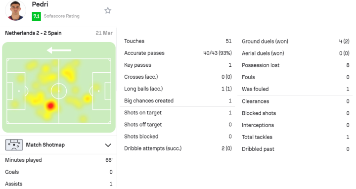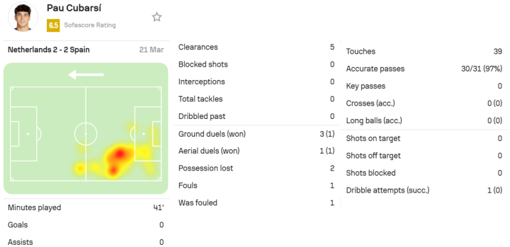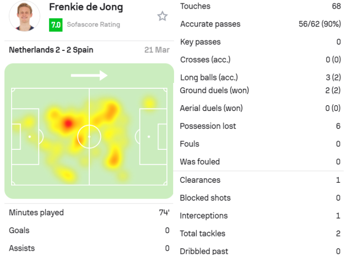 最近一场备受关注的荷兰对阵西班牙的比赛中,德容表现出色,首发出场74分钟,并且获得了7.0分的评分。他在比赛中多次抢断和解围,传球成功率高达90%,展现了自己的实力和稳定性。与此同时,库巴西在比赛中展现出了自己的技术和控球能力,虽然只出场41分钟,但传球成功率高达97%。